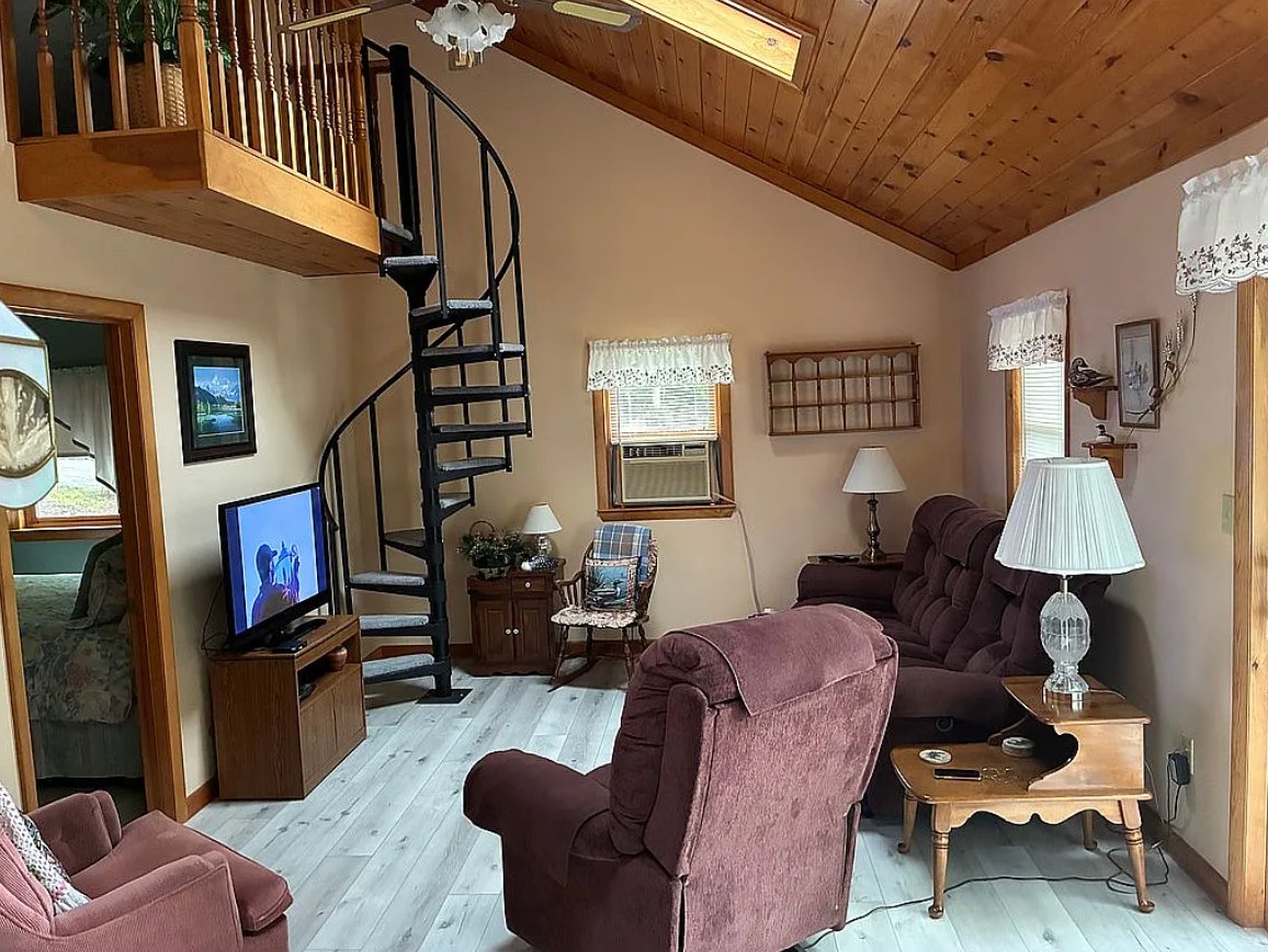 A charming spiral staircase leads to a spacious loft that sleeps 4, with an additional storage room/closet.