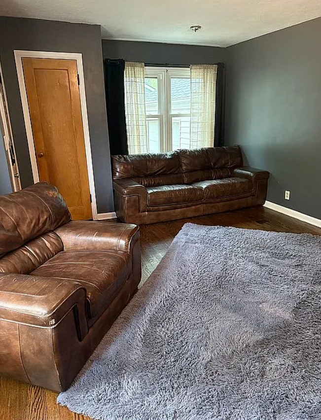 Inside, the main living area is filled with natural light from large windows and features refinished wood flooring throughout.