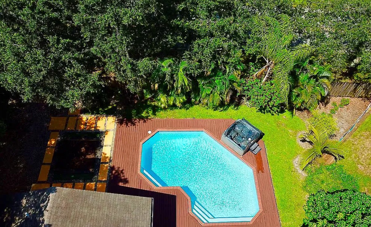 Step outside to your own tropical oasis with a newly renovated in ground pool, jacuzzi, and a large wood deck, ideal for entertaining or relaxing.