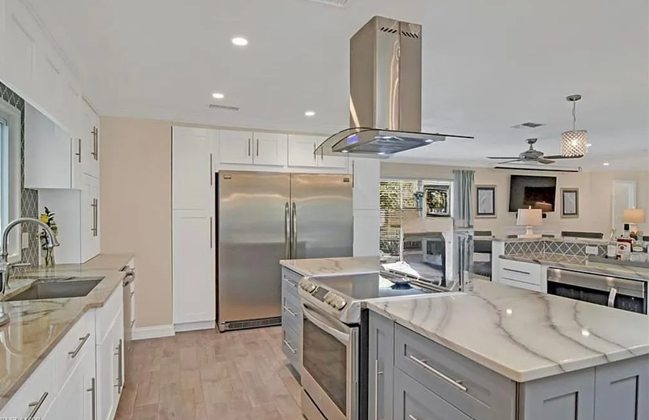 The gourmet kitchen is a standout with two islands, shaker cabinets, quartzite countertops, and high end stainless steel appliances—perfect for entertaining and everyday living.