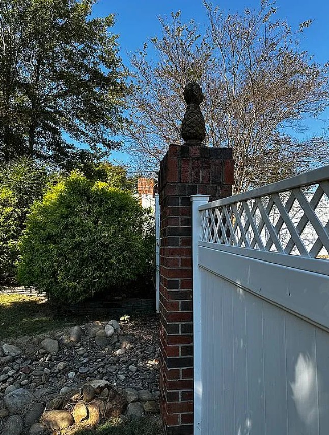 The fully fenced backyard features vinyl privacy panels with brick pillars and backs up to a wooded area no neighbors behind you.