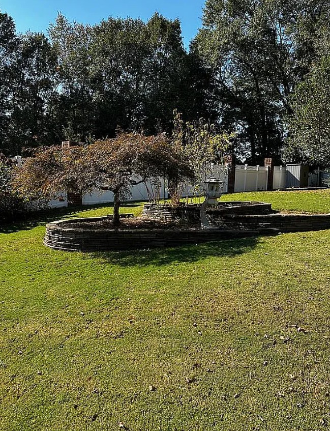 The lawn is fully irrigated with a 7 zone sprinkler system, making outdoor maintenance effortless.