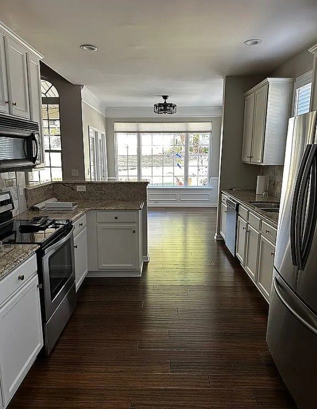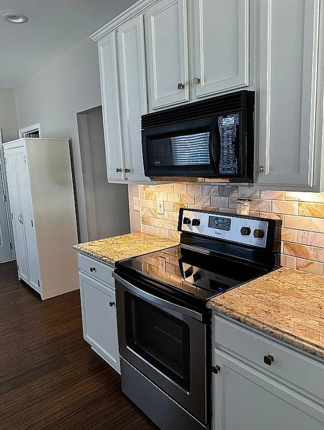 The kitchen is both stylish and functional with granite countertops, a marble tile backsplash, and stainless steel appliances.