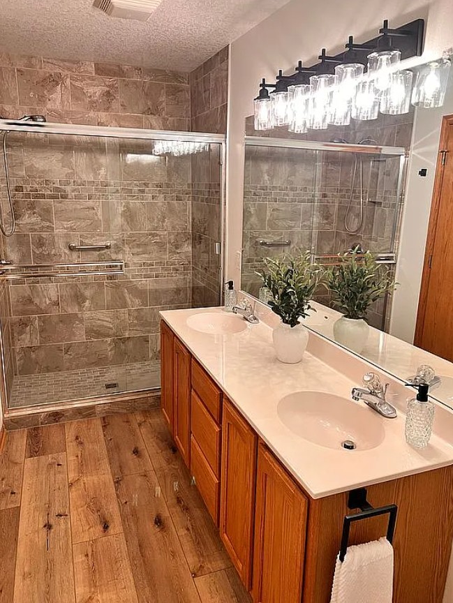 Primary suite with walk in closet, double sinks, and tiled walk in shower