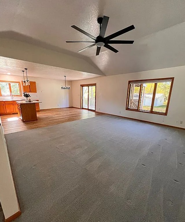 Spacious open-concept main level with high ceilings and luxury vinyl plank flooring