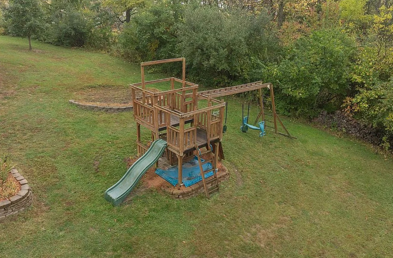 Children’s playset and fire pit area perfect for family fun and outdoor entertaining