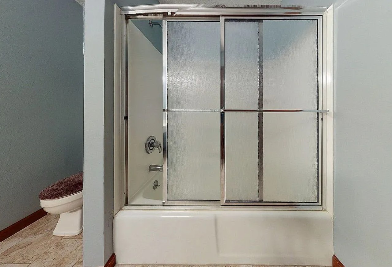 Spacious primary suite with walk in closet and private bath featuring tile floors and tub/shower combo