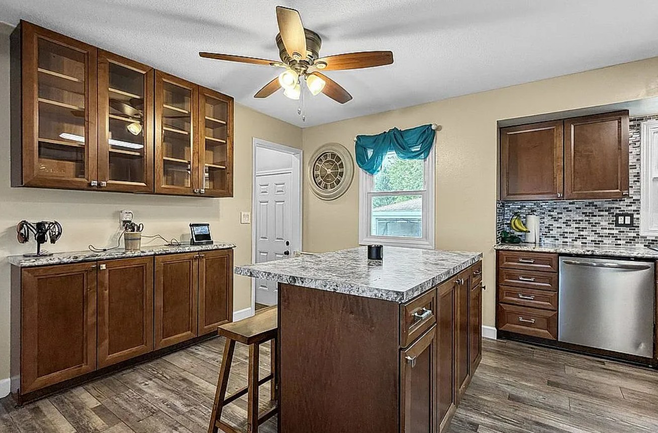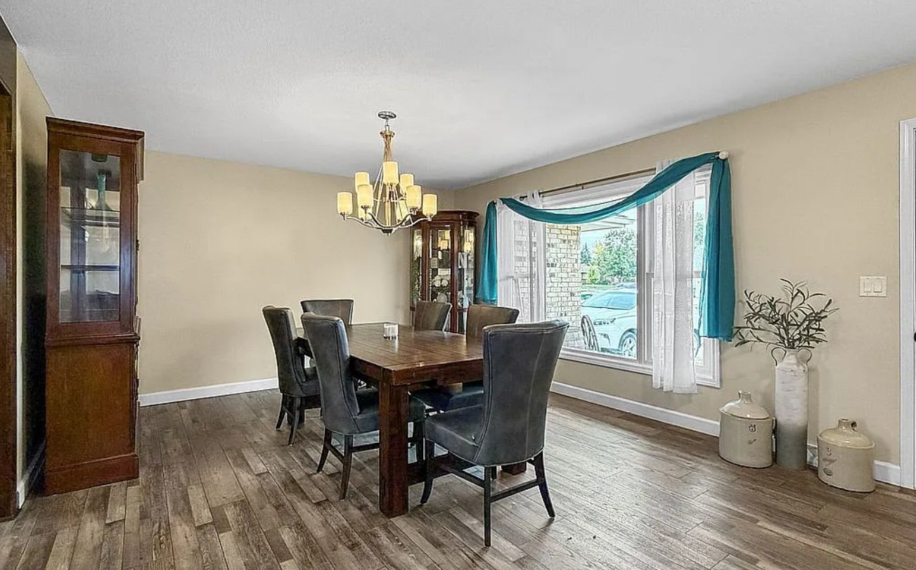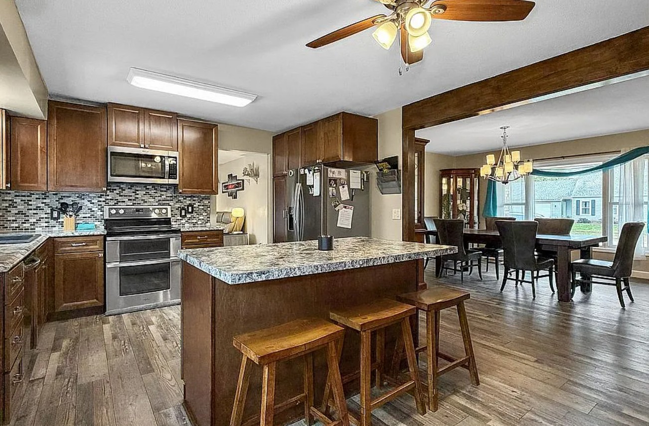 The large dining room flows seamlessly into a fully updated kitchen (2019) featuring natural wood cabinetry, tiled backsplash, laminate counters, stainless steel appliances, and an island breakfast bar.