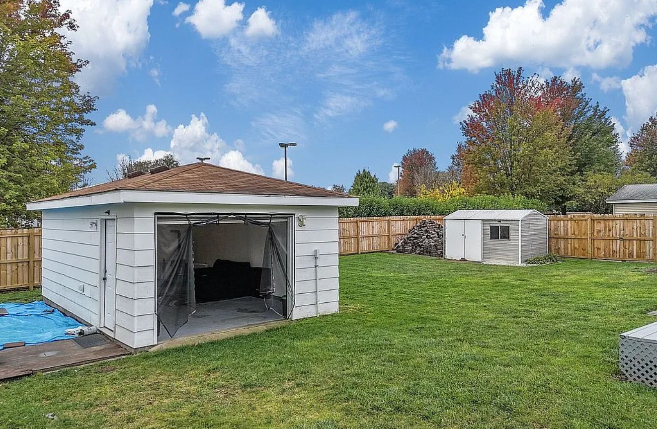 The level, fenced backyard features an outbuilding with electricity, perfect for a workshop, hobby space, or man cave, plus a utility shed for extra storage.