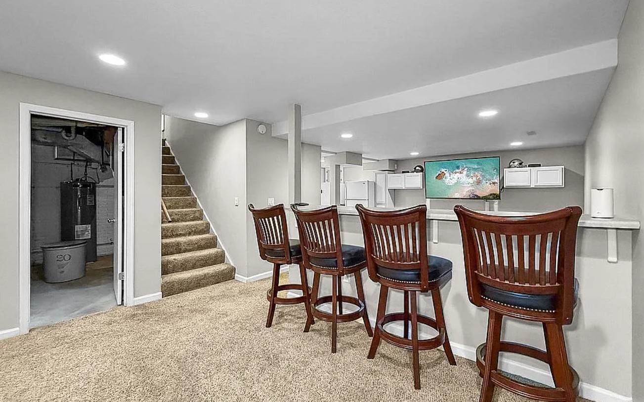 The finished lower level includes a large recreation room with egress window, a second kitchen, and ample space for games, fitness, or movie nights—along with laundry and storage (washer and dryer included).