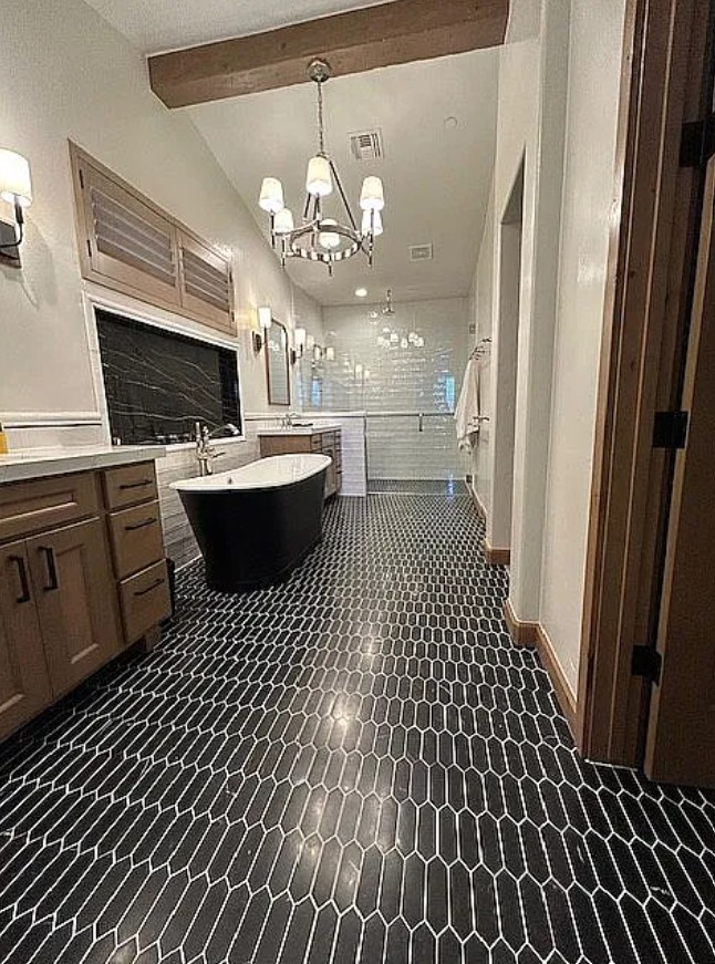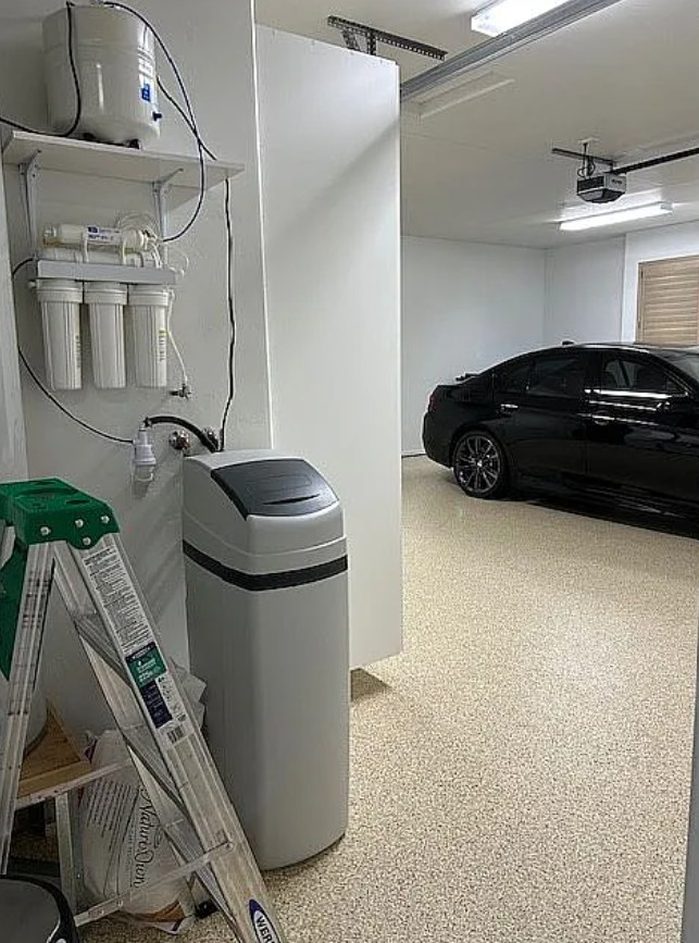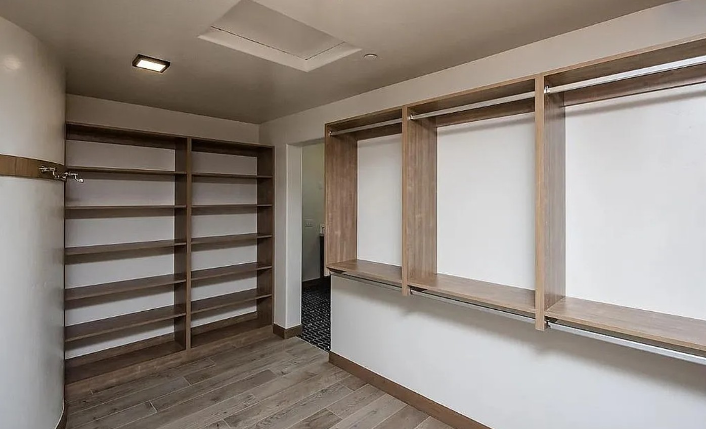 High-end finishes include quartz and leathered granite countertops, epoxy flooring, and smart networking for TV, data, alarm, and security cameras.