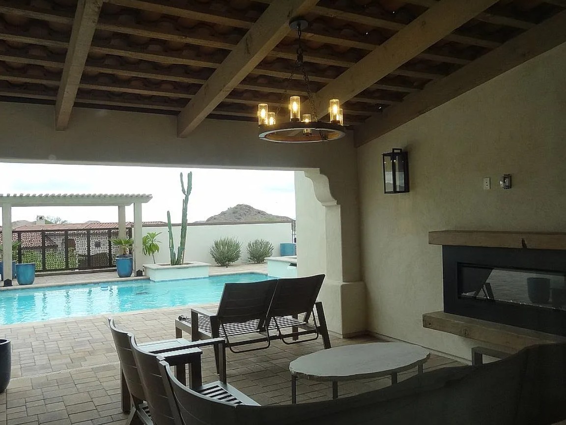 Enjoy the private backyard oasis with gorgeous panoramic views, a pool, spa, fire pit, and night lighting in both front and back yards.