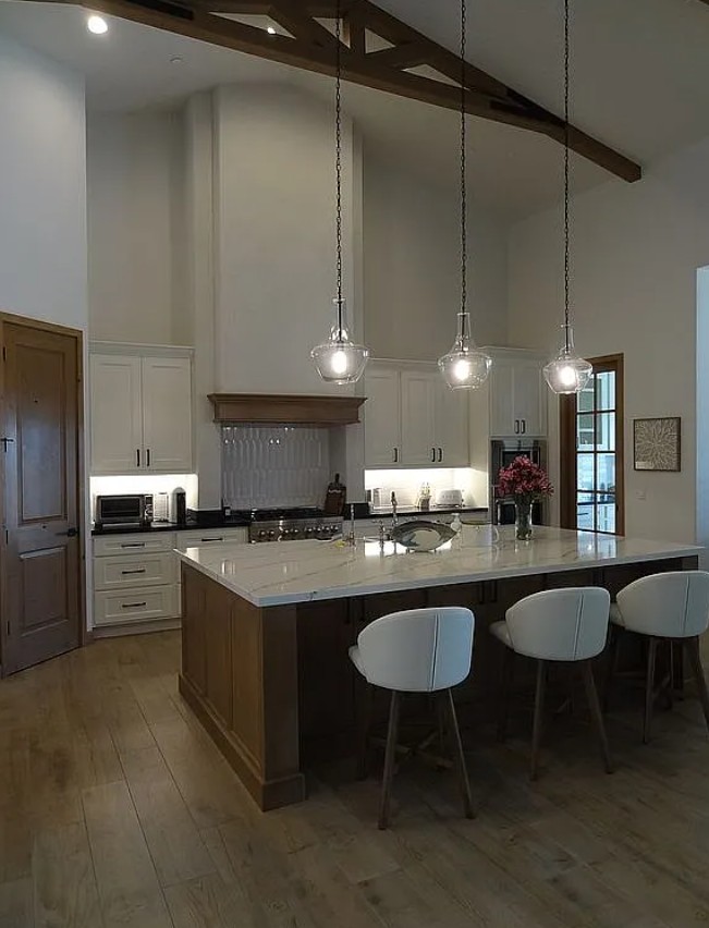 The open floor plan features 15 foot ceilings, a well-appointed wet bar with ice maker and wine fridge, and a gourmet kitchen complete with an oversized island, built-in dual refrigerators, commercial gas range (500 gallon underground LPG tank), and a walk-in butler’s pantry.