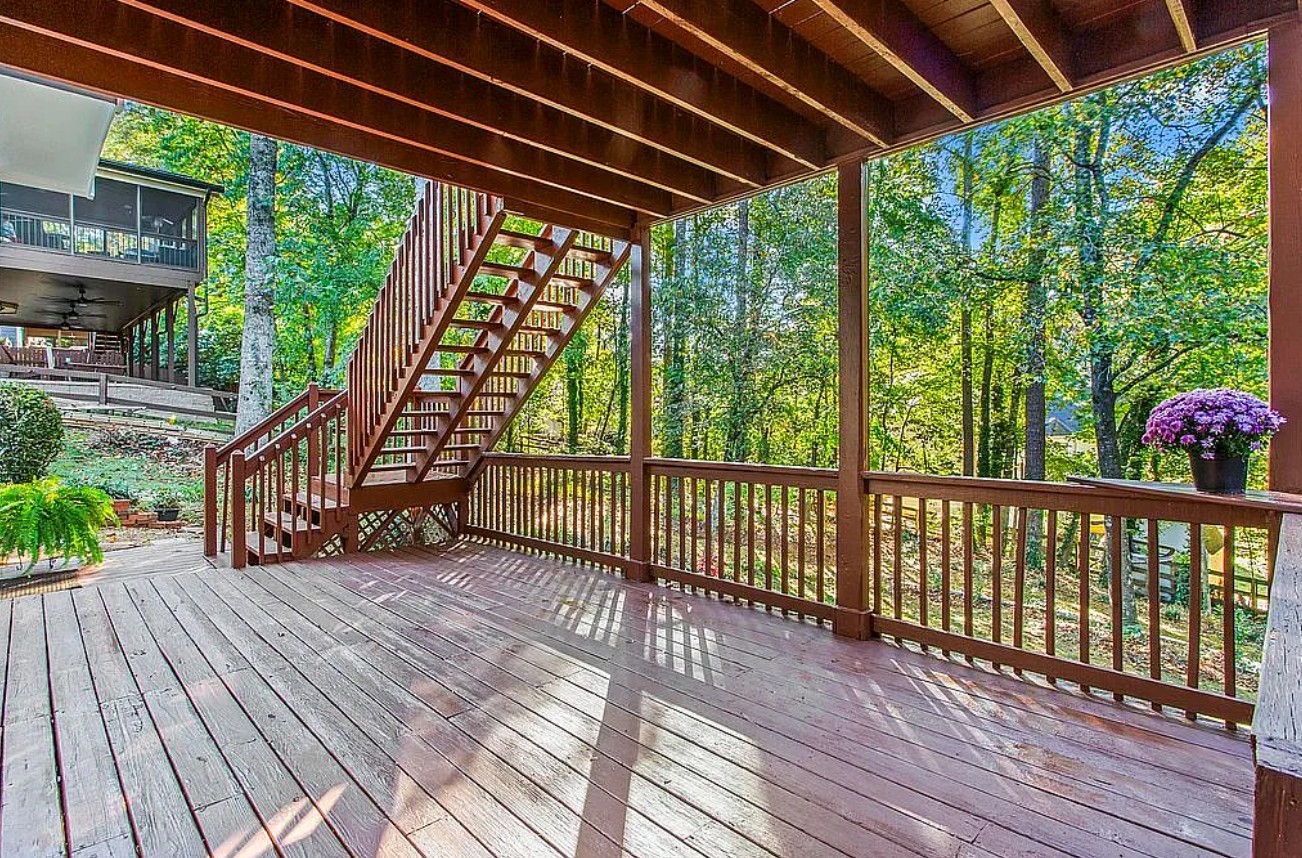 The upper level features a spacious den with a cozy fireplace and access to a newly renovated upper deck, ideal for entertaining or relaxing outdoors.