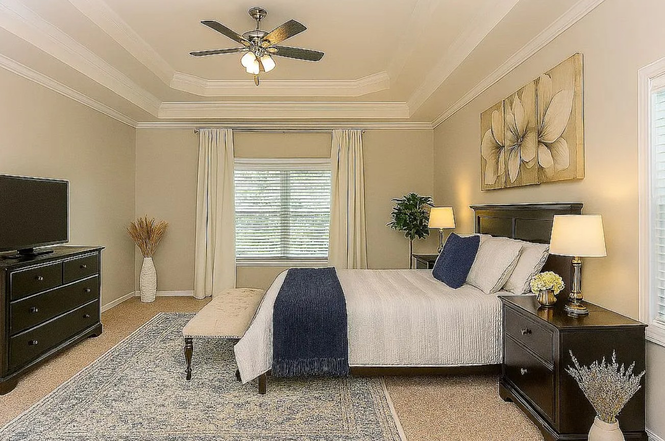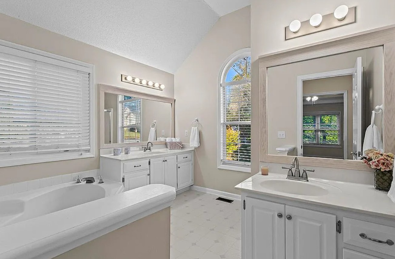 The master suite offers trey ceilings, detailed trim, a garden tub, dual vanities, a walk-in shower, and a walk-in closet for added comfort and luxury.