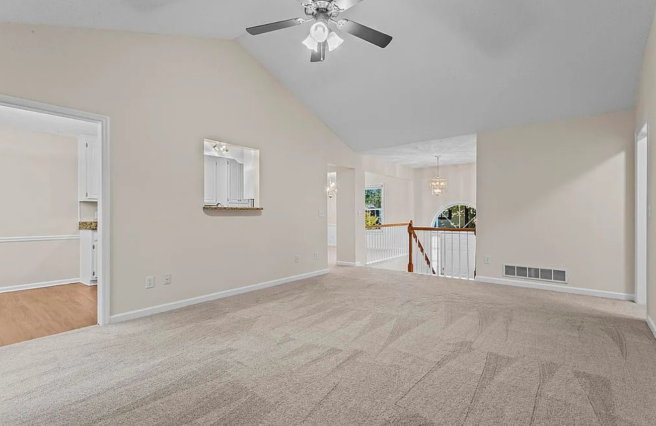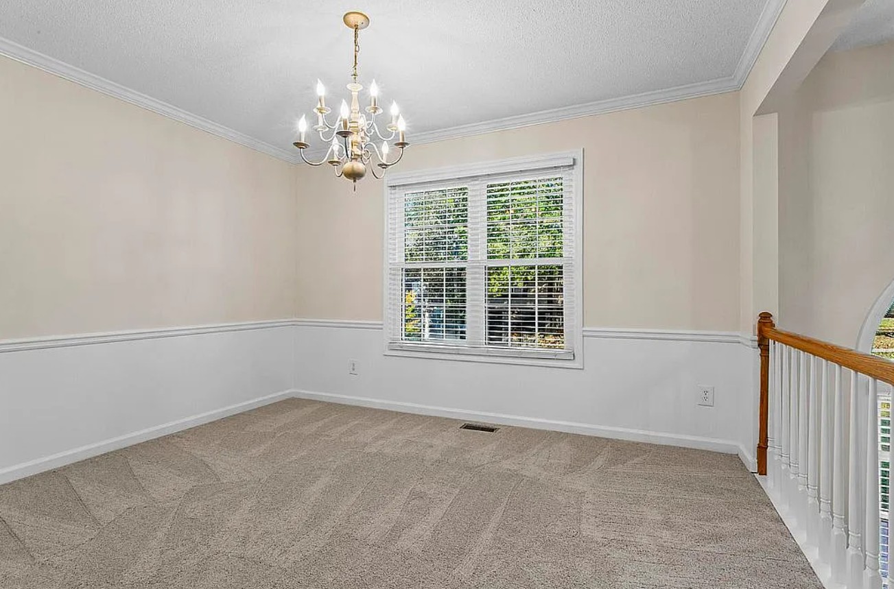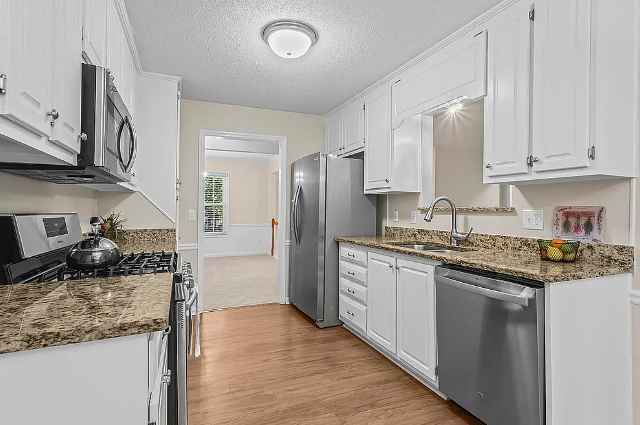 The updated kitchen includes granite countertops, stainless steel appliances, modern cabinets, and an adjacent elegant dining room that’s perfect for family meals or gatherings.