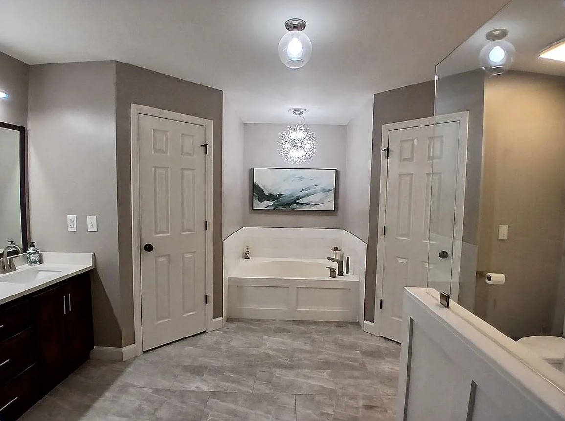 The spacious primary suite features his-and-hers walk-in closets, a spa style bath with a jetted soaking tub, tiled shower, and a double quartz vanity.