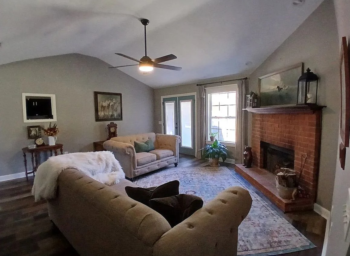 The living room offers a cozy wood-burning fireplace, French doors, and plenty of natural light.