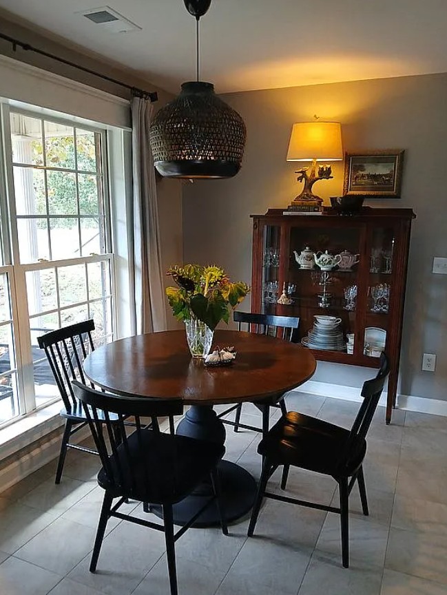 The gourmet kitchen boasts custom cabinetry, subway tile backsplash, a farmhouse sink, stainless steel appliances, and a casual eat-in dining area.