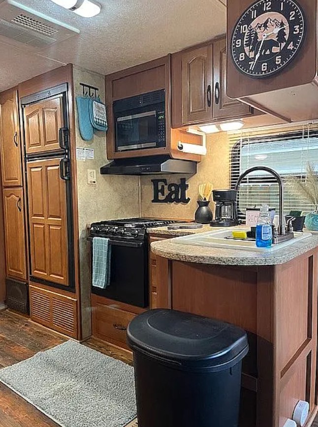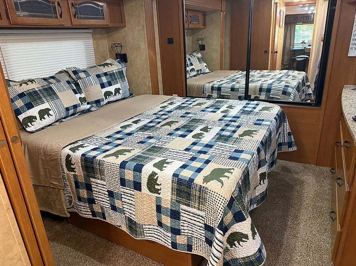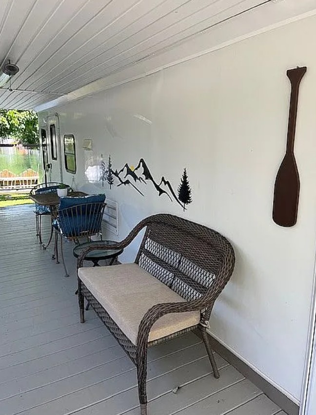 The camper features a roof-over design and a screened porch, ideal for year-round enjoyment.