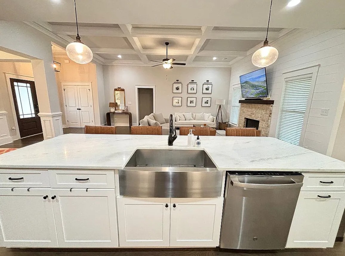 The gorgeous kitchen showcases stainless steel appliances, elegant finishes, and a spacious layout that flows into the large living room with coffered ceilings.
