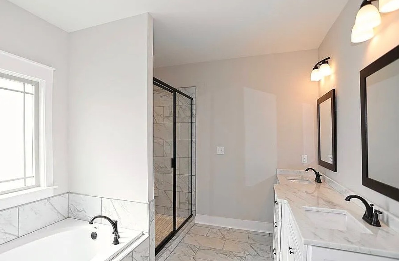 The master suite includes walk-in closets and a luxurious bath with dual vanities, while one guest room features a private en suite bathroom for added convenience.