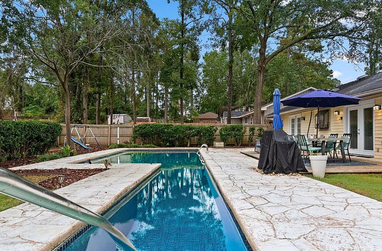 The fenced yard features a sparkling in-ground pool, a fire pit, and generous patio space ideal for entertaining, relaxing, or enjoying the privacy of your surroundings.