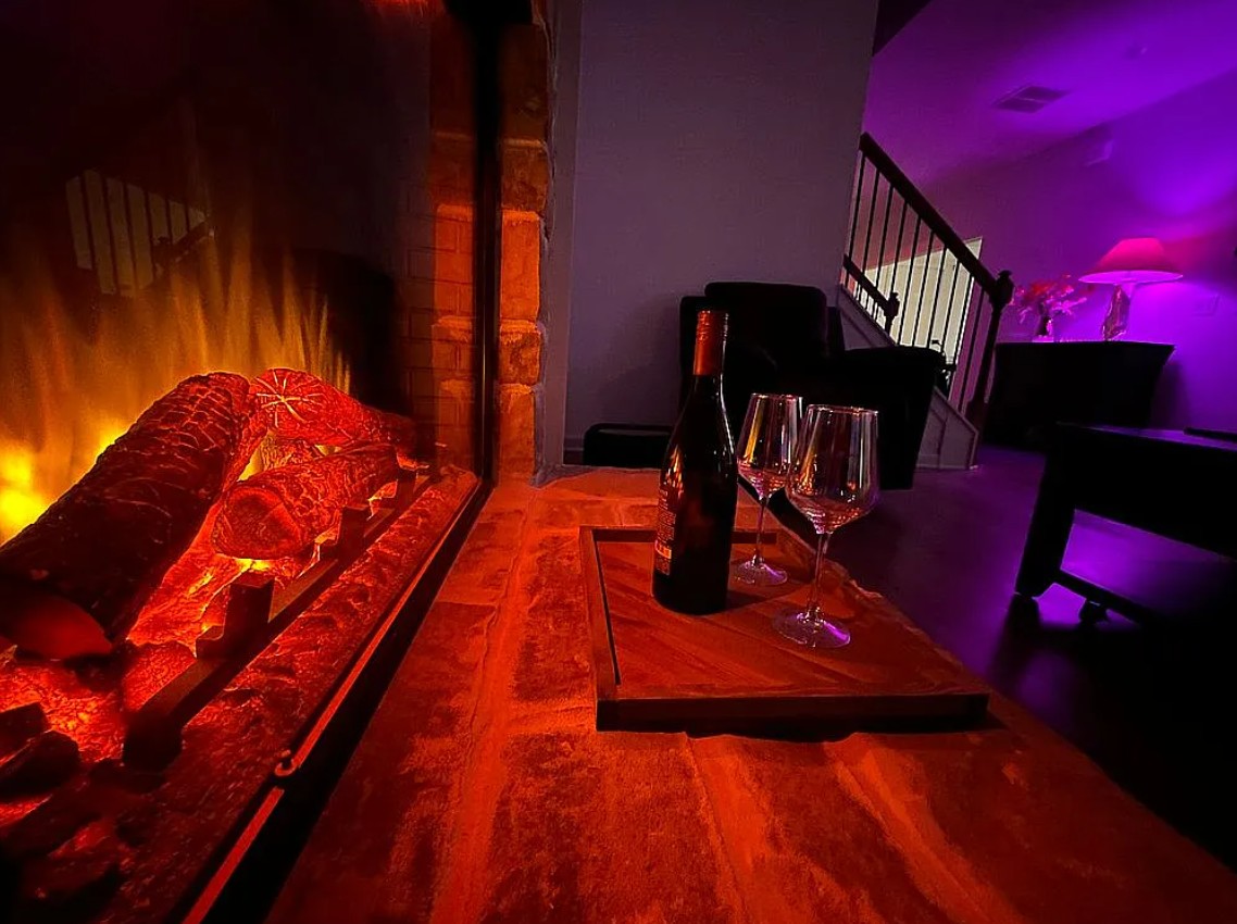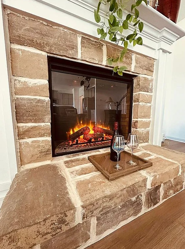 The open floor plan features tray ceilings, molded dining, and a cozy electric fireplace that adds warmth and character.