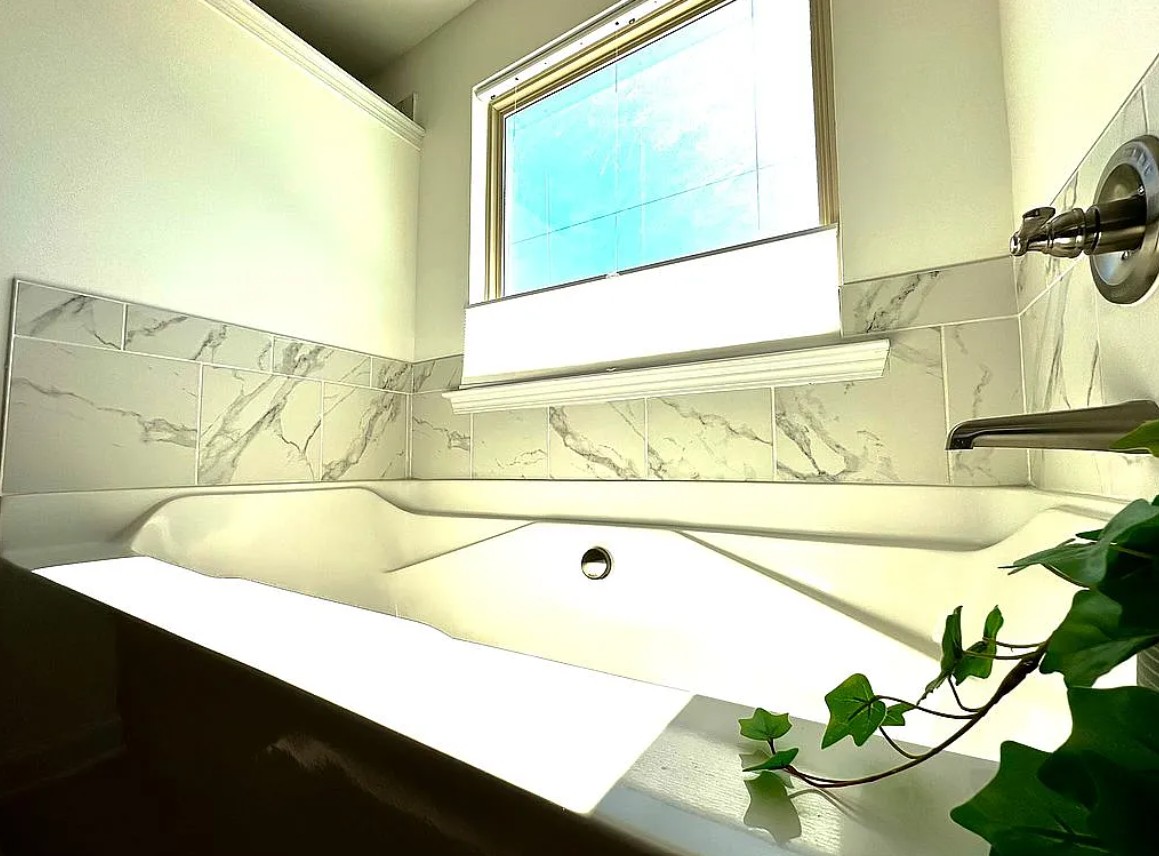 The main-level guest suite includes a full bath with a soaking tub, backyard views, and a personal closet ideal for visitors or extended family.