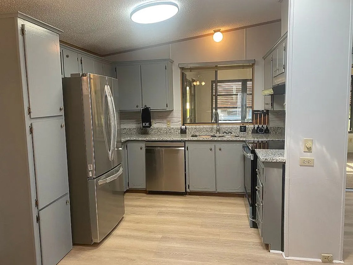 The modern kitchen features granite countertops and brand new stainless steel appliances, while the interior includes an inside laundry area with a new washer and dryer and luxury vinyl plank flooring throughout.