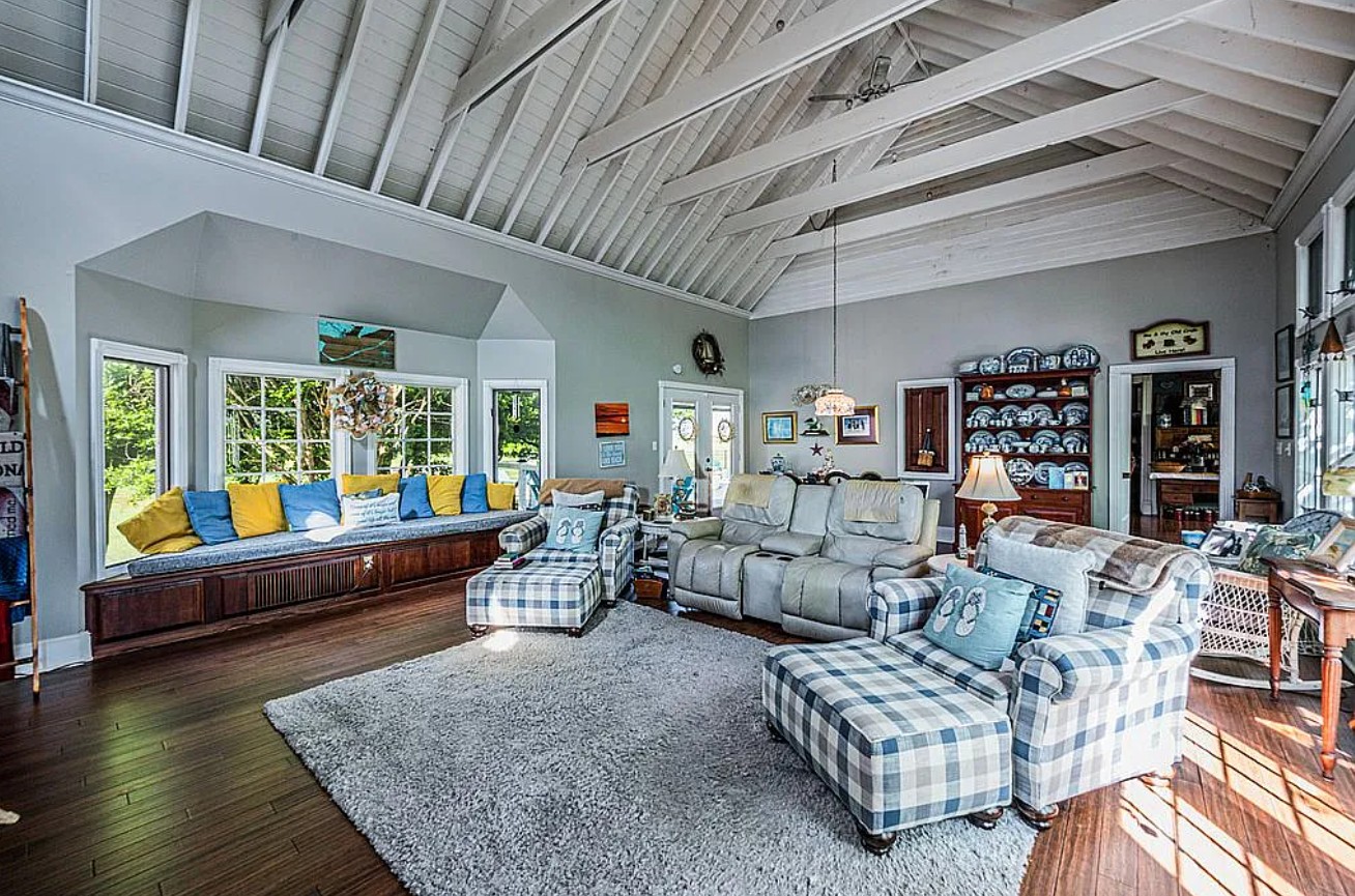 The great room, added in 1996, offers cathedral ceilings, a wood-burning fireplace, and a stunning bay window with bench seating.