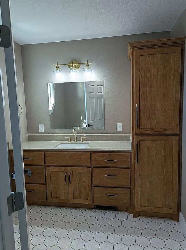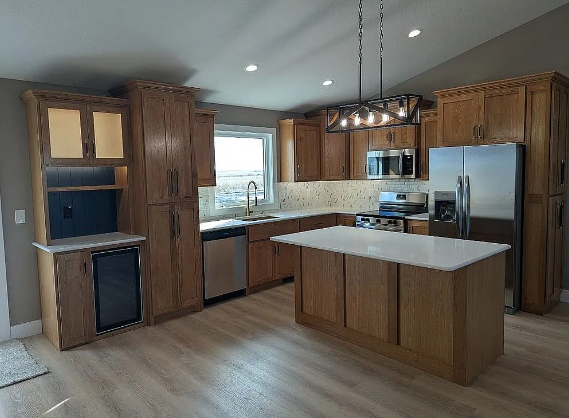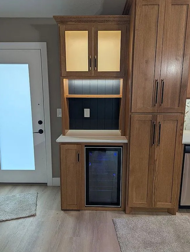 Built by Fox Construction, the home showcases stunning rift-sawn oak custom cabinetry throughout, complemented by quartz countertops, included appliances, and a convenient beverage station in the kitchen.