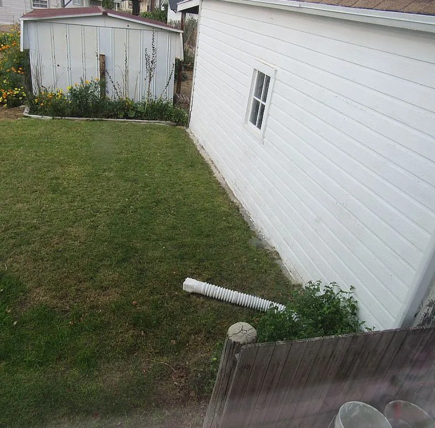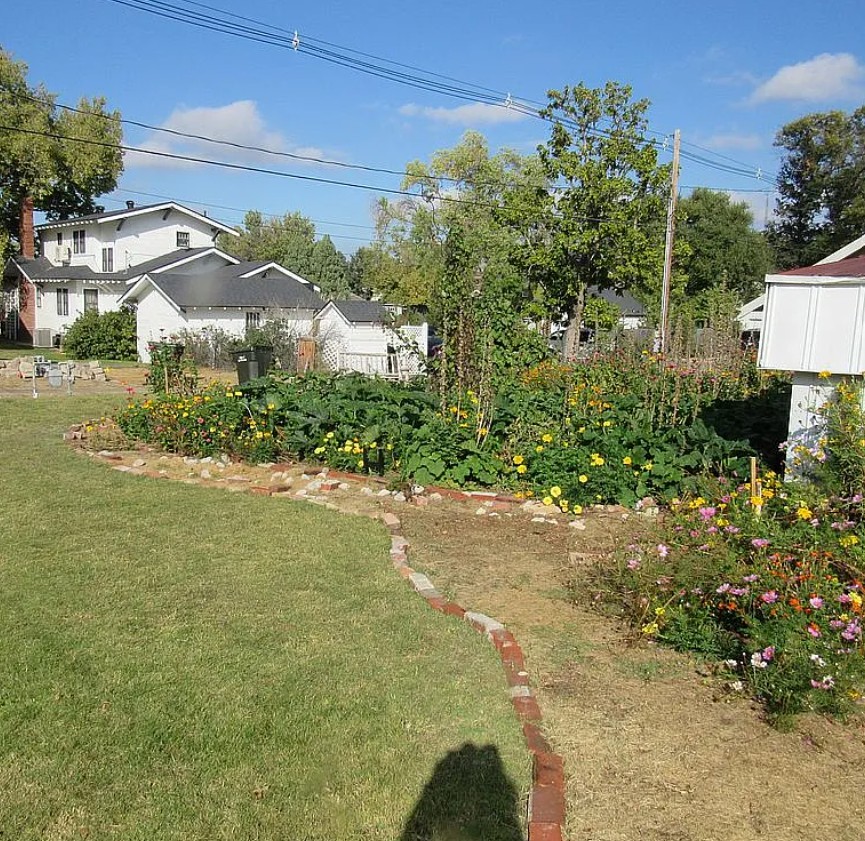 The property boasts an expansive garden area with rich soil, raised beds, and a mix of buffalo grass and lush greenery, perfect for gardening enthusiasts.