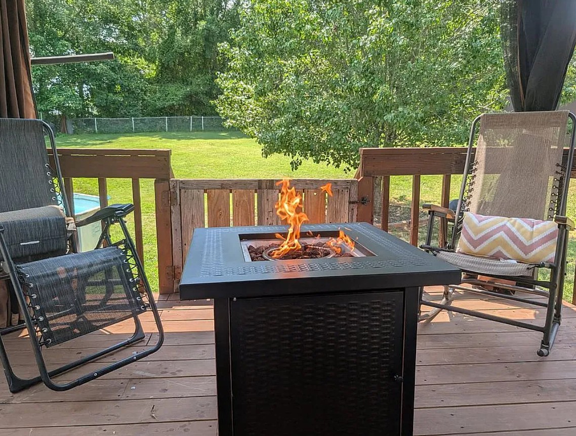 Outside, enjoy summer relaxation in the 14 foot above-ground pool.