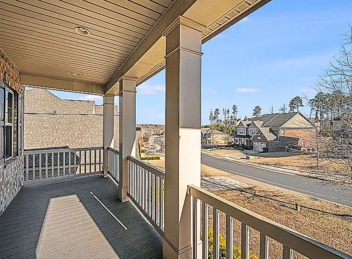 A relaxing first-floor balcony provides a private, tree-surrounded escape—ideal for unwinding, reading, or enjoying peaceful evenings above the backyard.