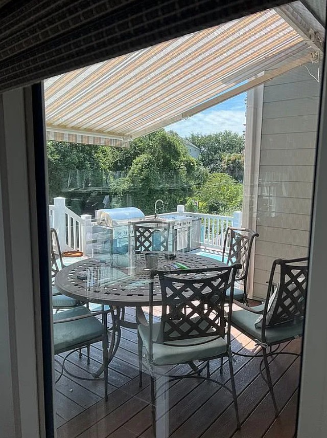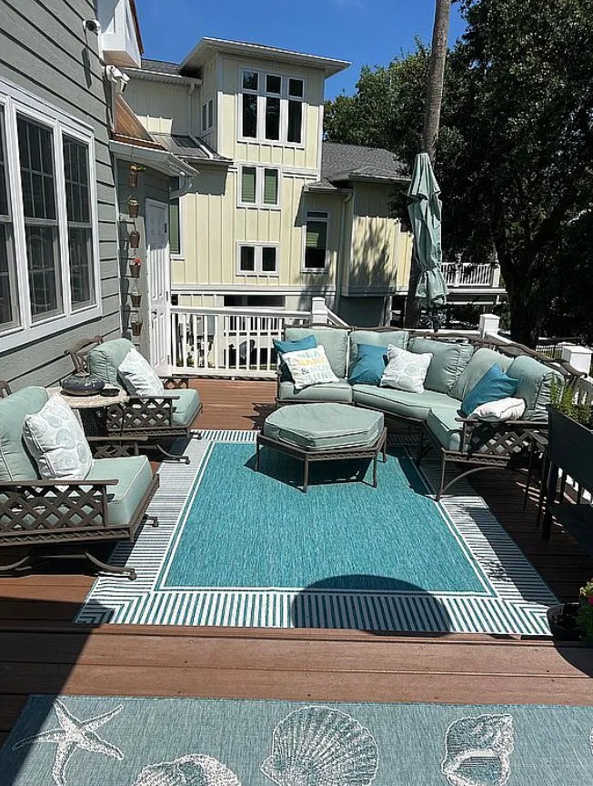Recent upgrades include new Trex front porch and staircase, large rear decks, SunSetter awning, hurricane rated garage shades, Juliette balcony, and central vacuum system replaced in 2025.