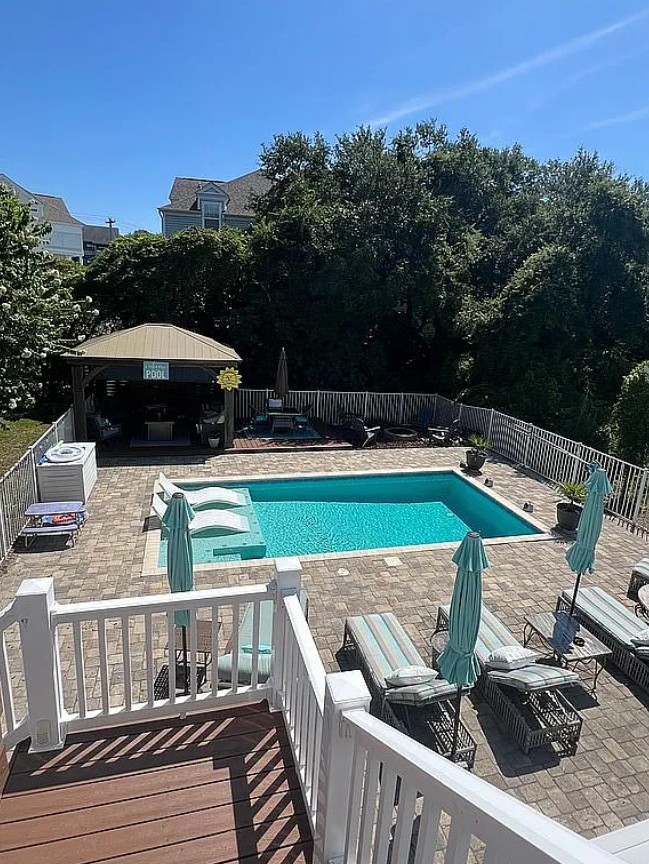 Set on a large yard framed by Crepe Myrtles and Live Oaks, the property features multiple outdoor living areas including a heated gunnite pool, gazebo, decks, patios, and an outdoor kitchen.