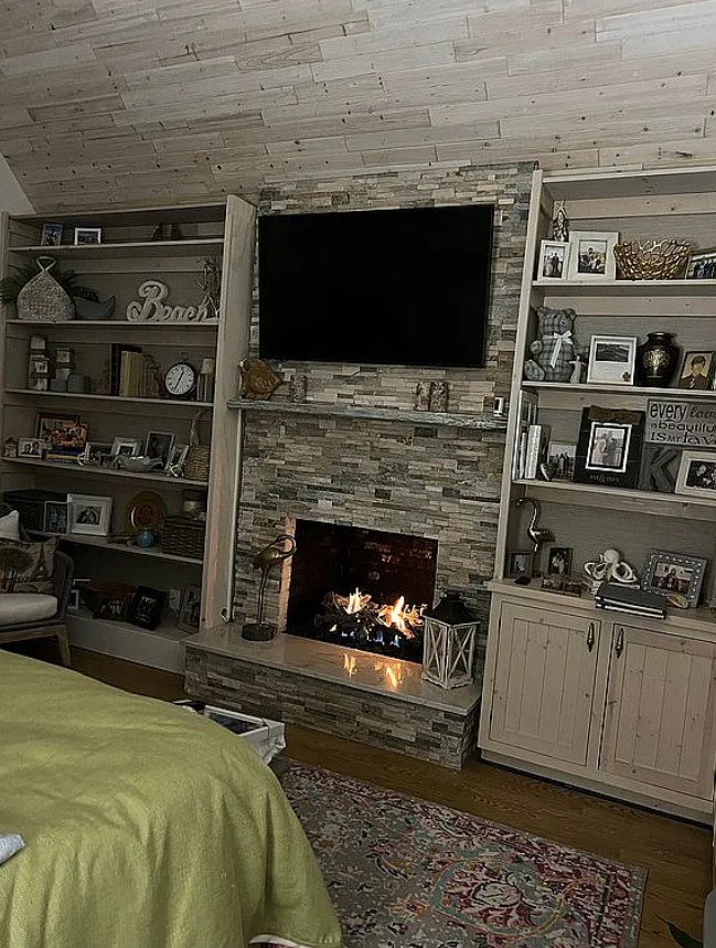 The master suite also includes a palladium window, wood whitewashed barrel ceiling, gas fireplace, and built-in bookshelves.