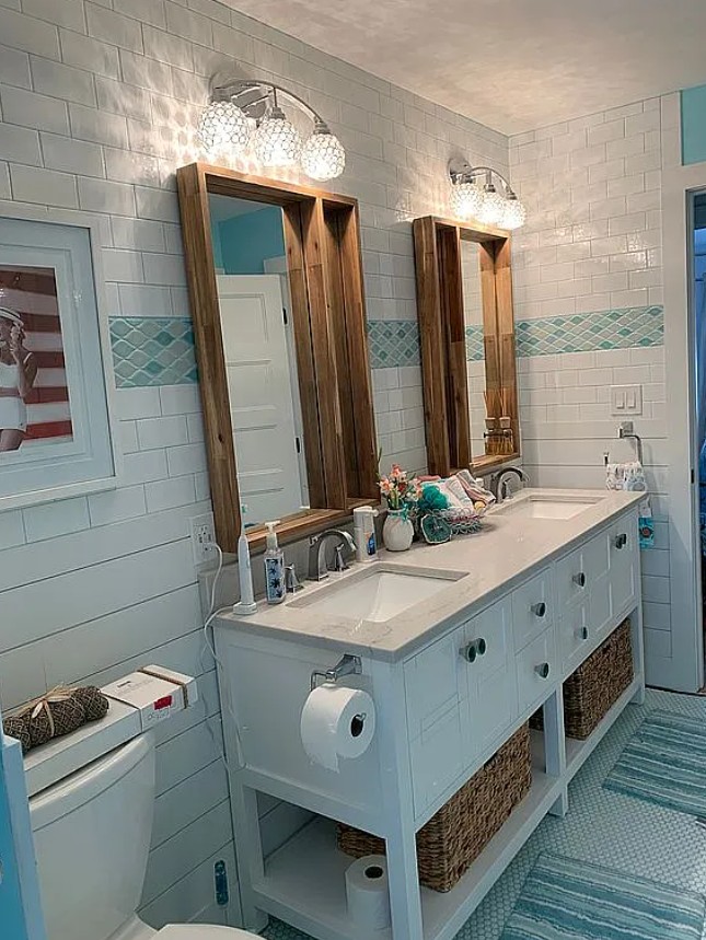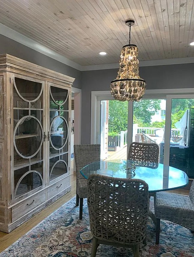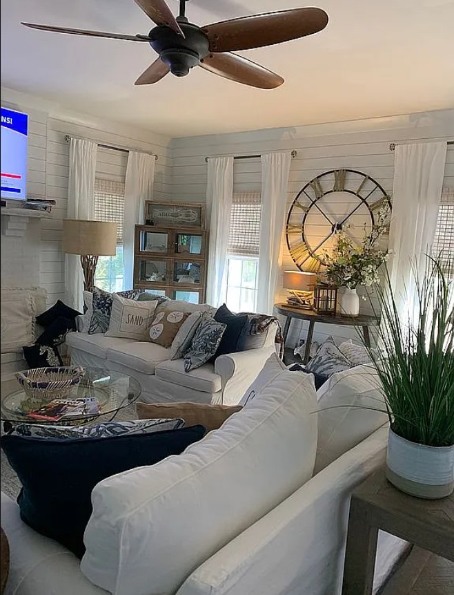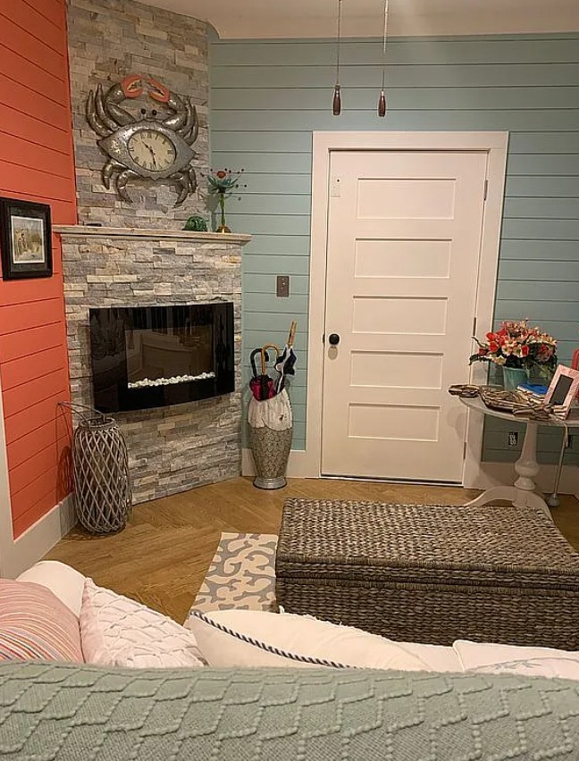The main living areas are accented with shiplap, batten boards, and wood details throughout ceilings, accent walls, and built-ins.