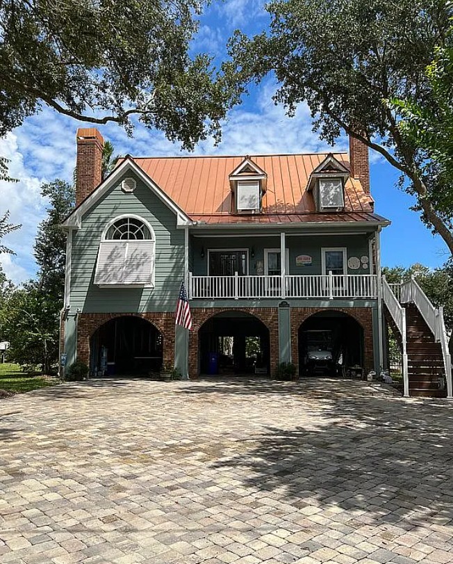 The home boasts a metal roof, elevator, large carport for 4 vehicles plus a golf cart, and invisible fencing for pets.
