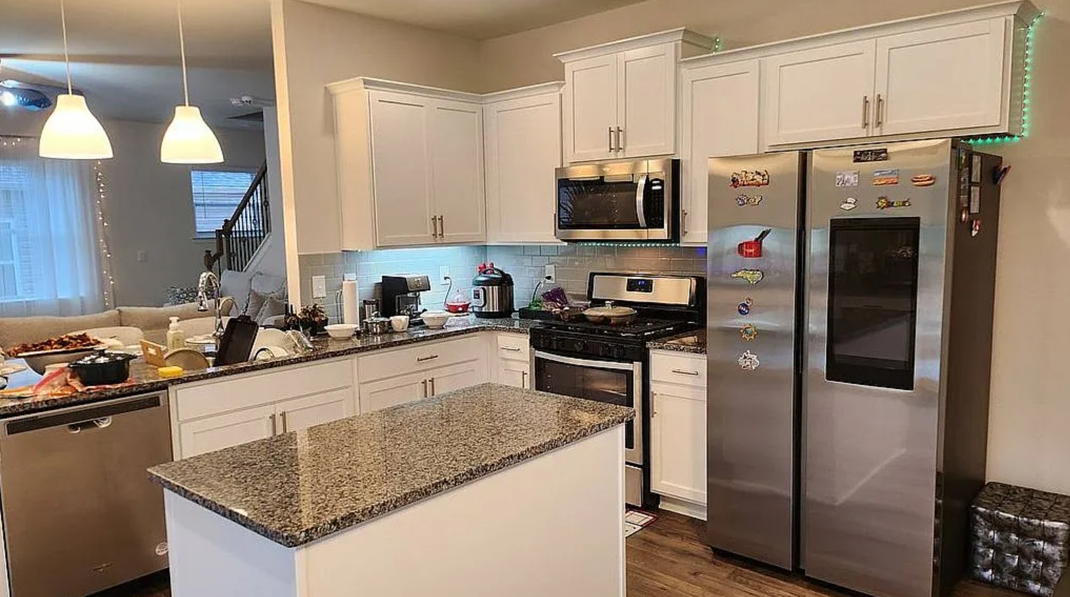 The spacious family room features a cozy fireplace and flows seamlessly into the kitchen, which boasts a prep granite island, tile backsplash, recessed lighting, and stainless steel appliances including a gas range, microwave, and dishwasher, along with a breakfast area for casual dining.