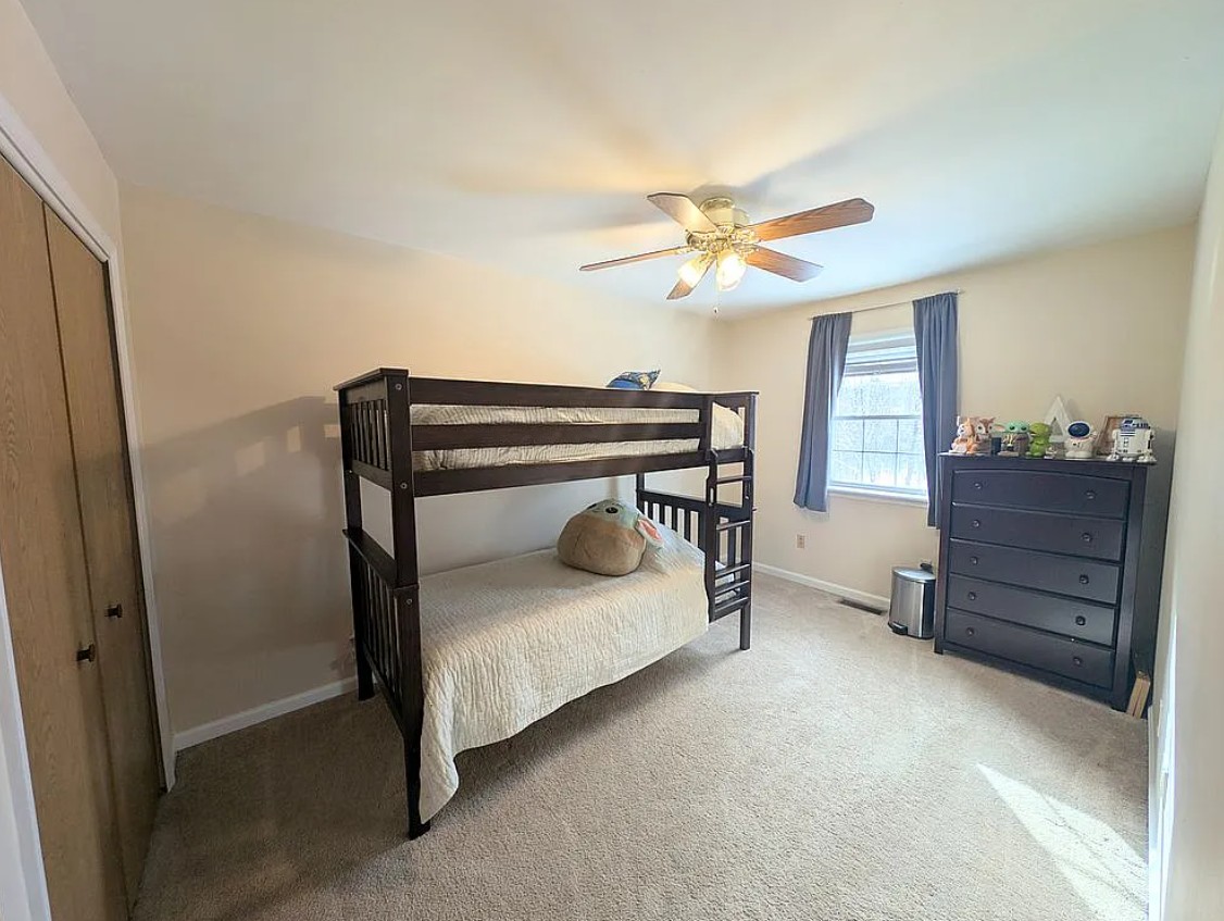 The main bedroom boasts a spacious walk-in closet, while the fully fenced backyard provides privacy with wooded views.
