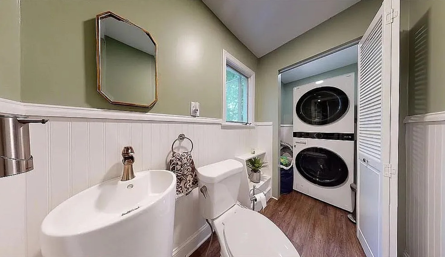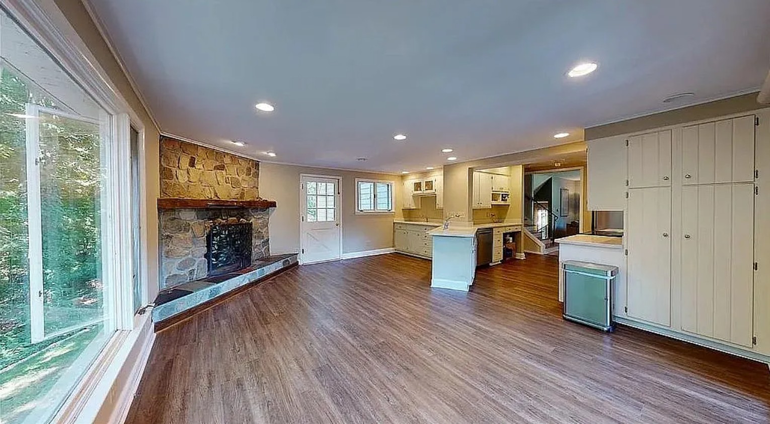 The home features a finished basement with bonus living space and a stylish bar area with concrete countertops, perfect for gatherings or relaxation.