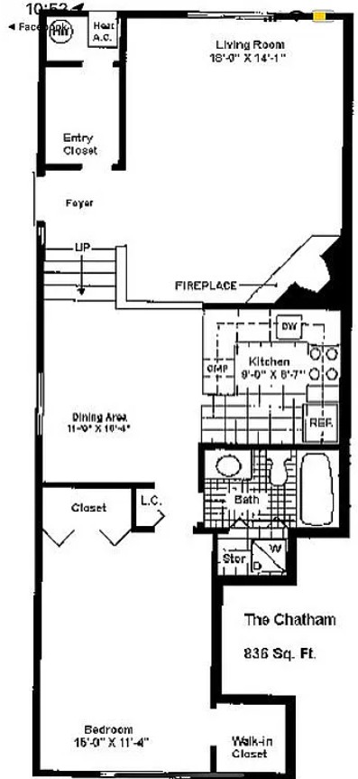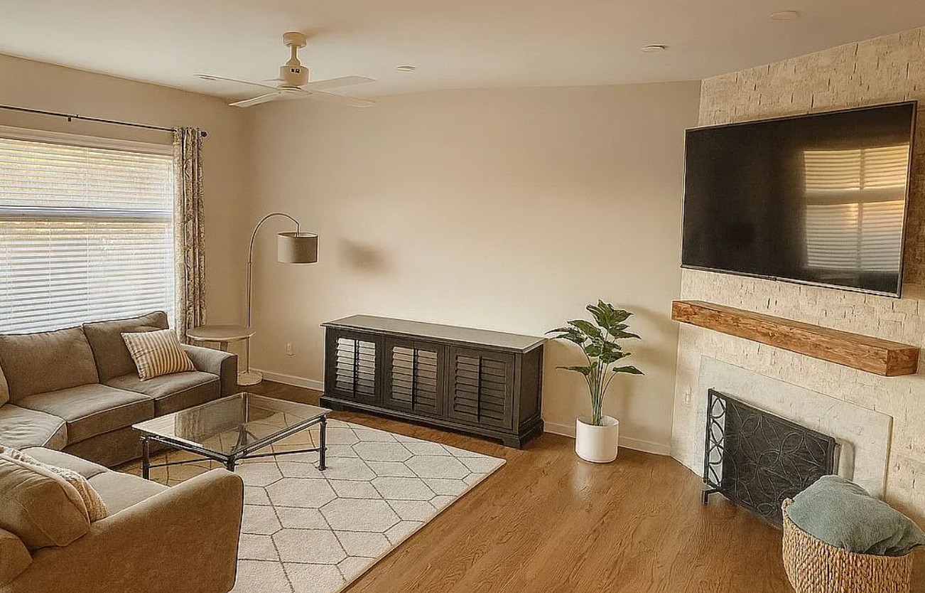 The open-concept living area includes a refurbished gas fireplace, a large entry closet with custom shelving, and plenty of room for entertaining or relaxing.