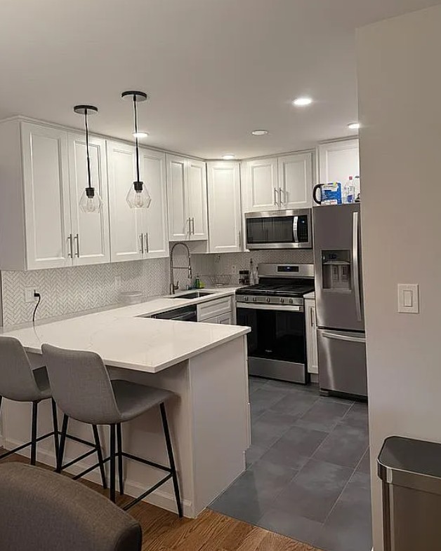 The updated kitchen showcases quartz countertops, a breakfast bar with seating for two, custom built-in dry bar for additional storage, and designer West Elm light fixtures.