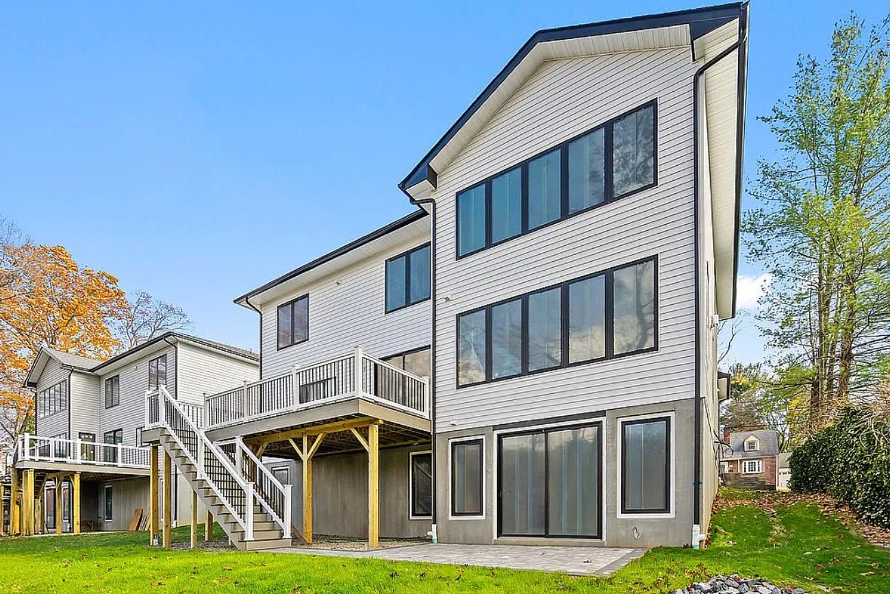 The home features 9 foot ceilings, expansive Andersen windows and oversized sliding glass doors, and an open-concept layout that fills all three levels with natural light and stunning lakefront views.