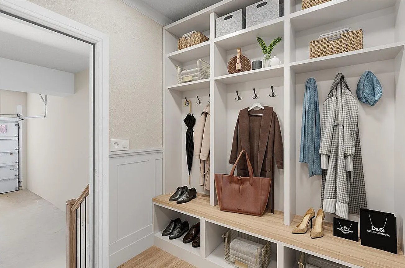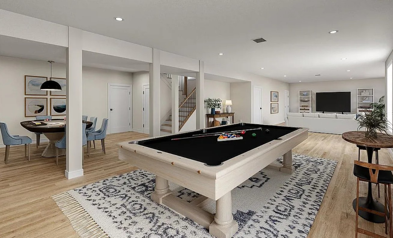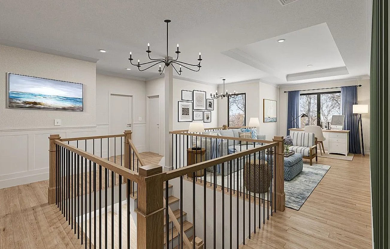 A striking open switchback staircase enhances the home’s modern, airy feel and seamlessly connects all three levels.