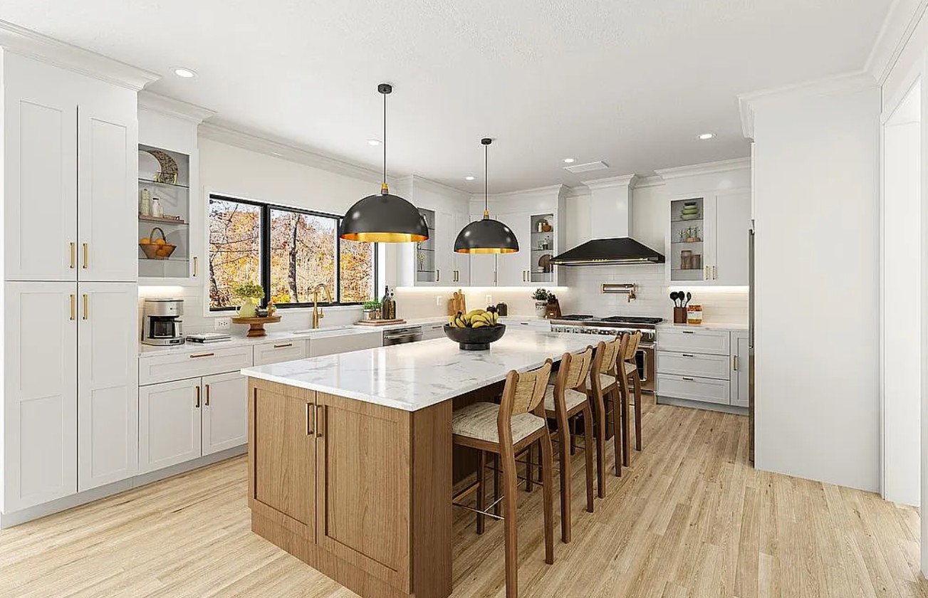 The gourmet kitchen is designed for both everyday living and entertaining, featuring a massive quartz island, professional 48 inch THOR gas range, and premium THOR appliances.