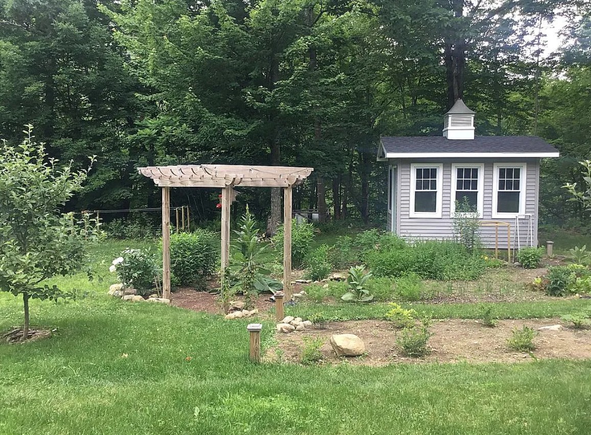 The property includes a colonial style predator-proof chicken coop, a small garden shed, and well maintained perennial gardens, fruit trees, raspberries, and lilacs.