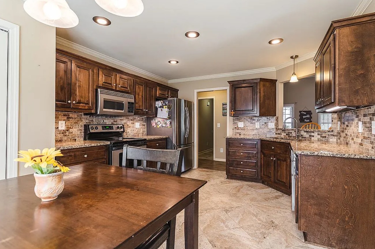 The kitchen has been beautifully updated with quartz countertops, a custom island, and newer appliances, making it ideal for everyday living and entertaining.